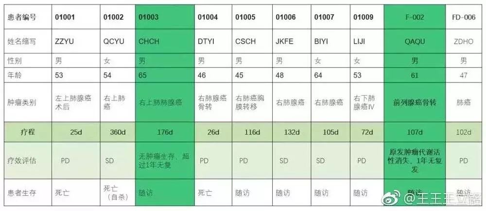 十个患者,五个注明了PD(疾病进展),三个SD(疾病稳定)。还有两个标绿的患者,没有说明CR/PR/SD/PD的情况,是单独用文字解释的,就是陈小平演讲当中提到的“可能已经治好”的病人。
