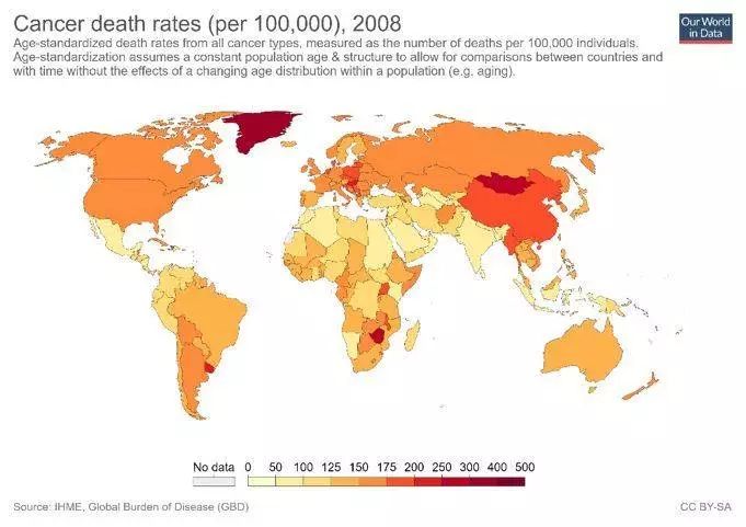 请注意,全世界范围内,美欧澳那几个地方确实是癌症高发的热点区域(这主要是受人均寿命提高的影响,癌症的发病率随年龄增加快速上升)。但是考虑到这些国家医疗水平的因素,癌症死亡率远远不是全球最高的。