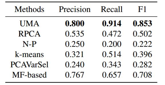 表 3:UMA 与其他算法在 Douban 10K 上的检测查准率,查全率以及 F1 得分对比。