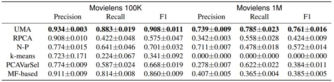 表 1:在结合了传统策略的无组织恶意攻击下,UMA 与其他算法在数据集 MovieLens 100K 和 MovieLens 1M 上的检测查准率、查全率以及 F1 得分对比。