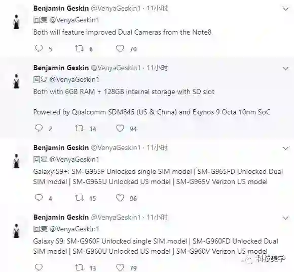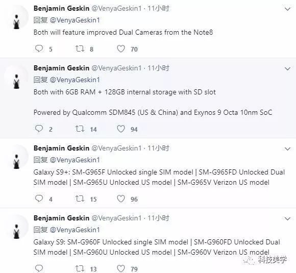 爆料达人@Benjamin Geskin 日前带来了三星新旗舰的消息。他表示,和S8、S8+一样,S9系列也将提供S9、S9+一小一大两款。型号分别为: