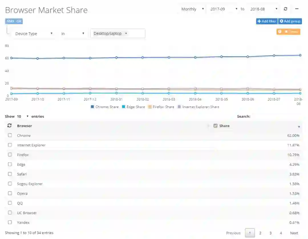 图中统计了 2017 年 9 月至 2018 年 8 月的浏览器份额统计。其中,Chrome 一骑绝尘,占比 62%;IE、Firefox 分列二三,占比均为 10% 左右;其余的占比均在 5% 以下,包括 Edge、Safari、搜狗、Opera 等。而且根据近一年的统计曲线可以直观地看出,各浏览器的市场份额比重几乎无任何变化,可见,这种傲视群雄的趋势还会持续很长一段时间。