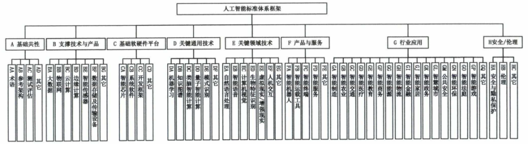 1.术语标准。用于统一人工智能相关概念、技术、应用行业场景,为其他各部分标准的制定和企业人工智能研究提供支撑,包括人工智能术语相关定义、范畴、实例等标准。