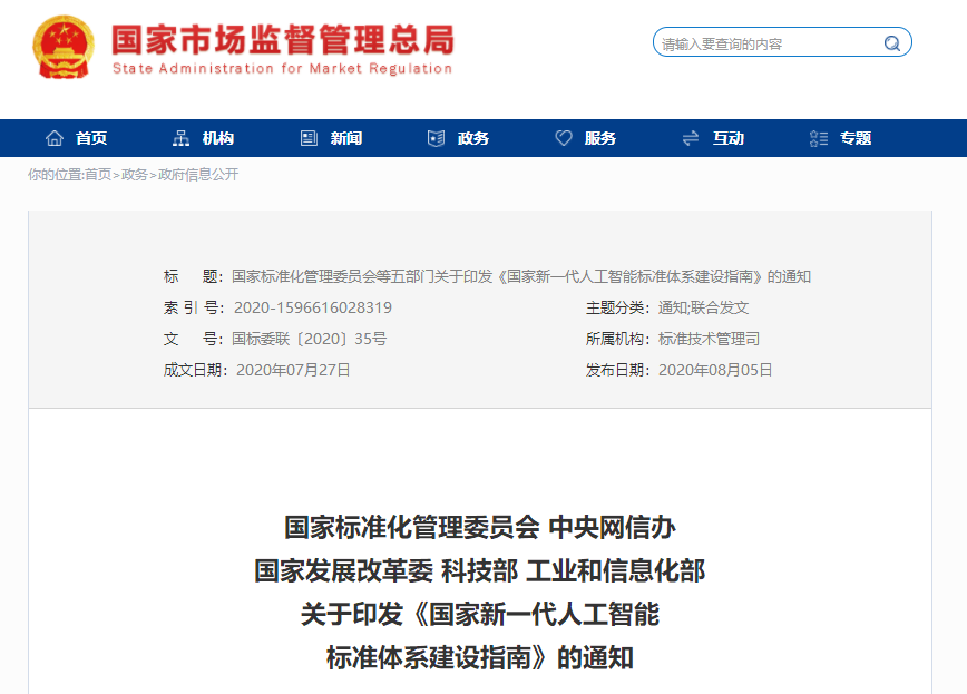 据国家市场监督管理总局消息,8月5日,国家标准化管理委员、中央网信办、国家发展改革委、科技部、工业和信息化部等五个国家部门联合印发了《国家新一代人工智能标准体系建设指南》(以下简称《标准指南》)。旨在加强人工智能领域标准化顶层设计,推动人工智能产业技术研发和标准制定。