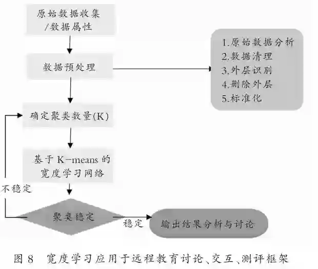 远程教育中的讨论互动,对于学生的知识掌握与构建十分重要。基于以上实验的研究,可以将基于K-means聚类算法的宽度学习应用于远程教育讨论交互测评中,通过对具有共同语言行为学习模式的学生的聚类,帮助教师更加了解学生行为,以改进教学策略,加强学生和教师之间的有效互动,促进远程教育教学交互,助力现代远程教育的健康发展。将宽度学习应用于远程教育讨论、交互、测评,可建构如下框架,具体过程与步骤如图8所示。