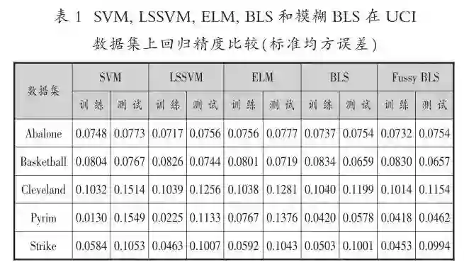陈俊龙团队在对数据维度为1万-3万的20万数据测试中发现,在3-50分钟之内,宽度学习都能够很快地找到神经网络的权重。在UCI数据上回归精度比较分析发现,宽度学习系统和模糊宽度学习系统都表现出较高的精度,具体比较结果参见表1。[21]