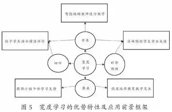 具体来说,我们期待宽度学习可在准确预测学生学业成绩、给予学生演示精准评价、提供小组个性学习支持、智能辅助教师进行教学和促进远程教育教学交互等方面,发挥其既快又准的优势,为促进教育信息化和智能化发展服务。我们根据宽度学习四个方面的优势特性,以及发挥维度所确定的宽度学习应用前景,建立了如下框架(如图5所示)。
