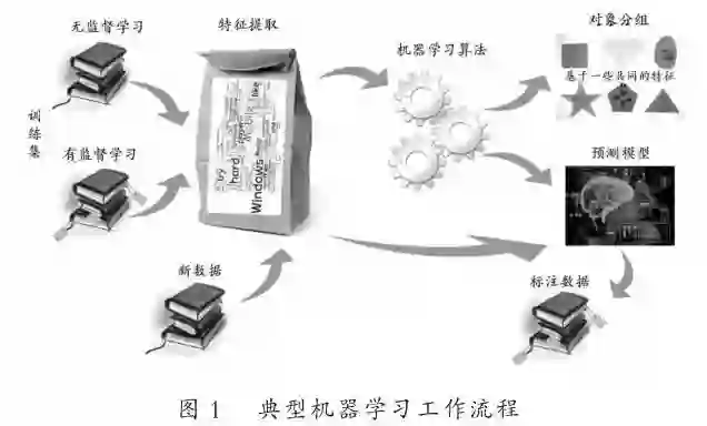 《机器学习》一书的作者汤姆•米歇尔(Tom-Mitchell)认为,机器学习的本质乃是通过经验,不断地提升自身的系统性能。[4]也就是说,机器学习可以从数据中进行学习,并通过利用数据而不断完善自身系统,优化程序性能。根据所需要处理的数据是否存在作为标注,机器学习可以分为有监督学习(Supervised Learning)和无监督学习(Unsupervised Learning)。图1就是一个典型的机器学习任务简化工作流程图,它同时展示了两类机器学习的处理过程。[5]