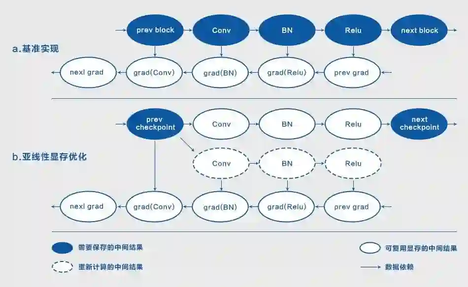 图 1(a) 给出了卷积神经网络的基本单元,它由 Conv-BN-Relu 组成。可以看到,反向计算梯度的过程依赖于前向计算获取的中间结果,一个网络需要保存的中间结果与其大小成正比,即显存复杂度为 O(n)。