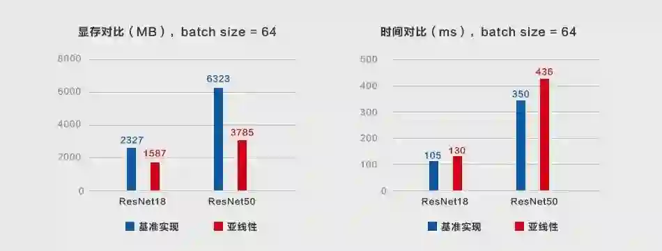 MegEngine 基于亚线性显存技术开展了相关实验,这里固定 batch size=64,在 ResNet18 和 ResNet50 两个模型上,考察模型训练时的显存占用和计算时间。