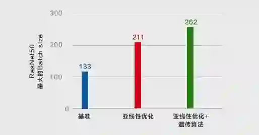 如图 2 所示,采用型号为 2080Ti 的 GPU 训练 ResNet50,分别借助基准、亚线性、亚线性+遗传算法三种显存优化策略,对比了可使用的最大 batch size。仅使用亚线性优化,batch size 从 133 增至 211,是基准的 1.6x;而使用亚线性+遗传算法联合优化,batch size 进一步增至 262,较基准提升 2x。