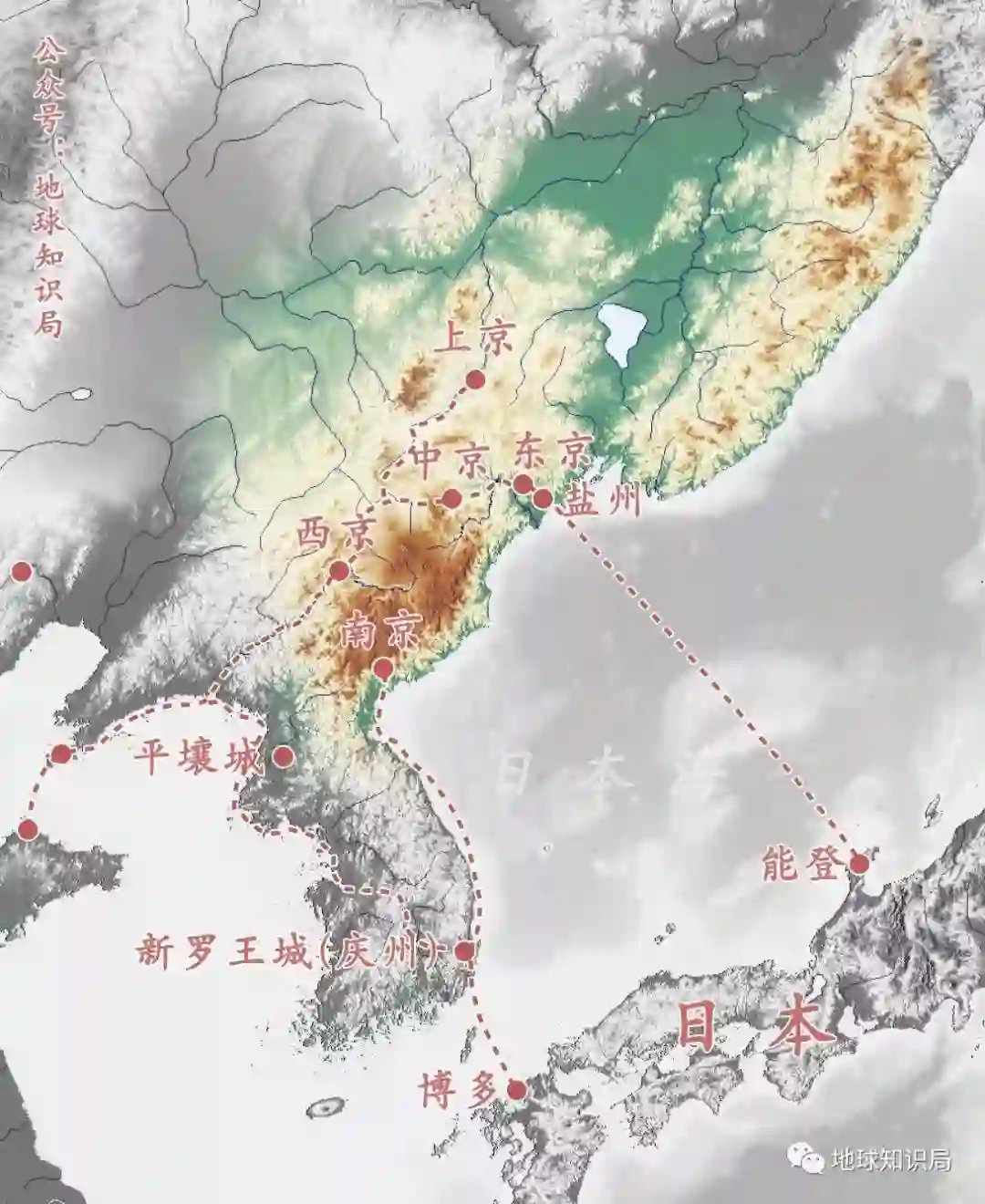 接着从渤海国去往日本的路线,主要有两条,一条是从南海府(南京)出发,沿着朝鲜半岛东海岸横渡朝鲜海峡直抵日本九州的博多。另一条则从盐州(临近今俄罗斯克拉斯基诺)出发,横跨日本海,从日本的能登、加贺一带登陆。