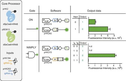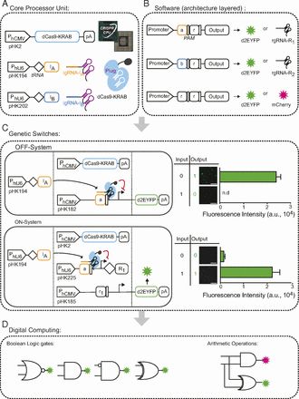 Cas9 蛋白的特殊变体构成了处理器的核心。在响应向导RNA序列提供的输入的过程中,CPU 控制了特殊基因的表达,制造出一个特殊的蛋白。研究人员们通过这个方案,可以在人体细胞中编程可升级的电路。这些电路就像一个数字半加器,由两个输入和两个输出组成,可以执行两个单位二进制数的加法。