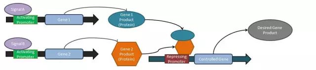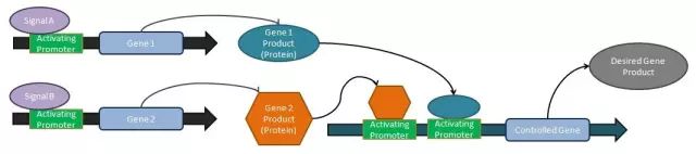 基于从数字世界中借鉴而来的模型,用基因开关控制基因表达,一直是合成生物学的主要目标之一。数字技术采用所谓的“逻辑门”处理输入信号并创造电路。下面两幅图分别展示了合成生物学电路的逻辑与门和逻辑或门。