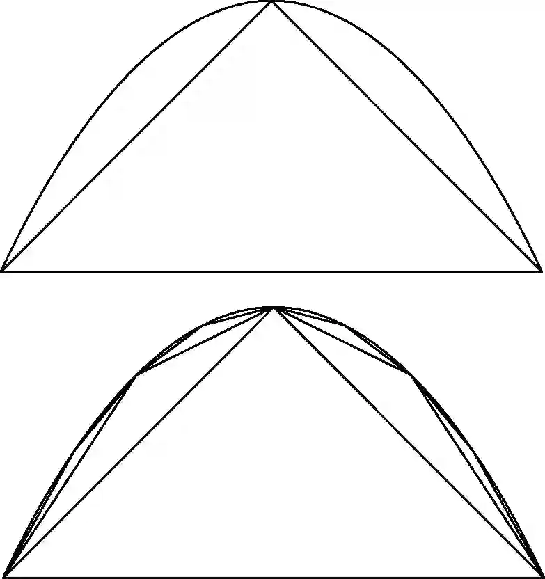 ……也就是抛物线内接多边形的面积,它总是比抛物线弓形本身的面积小。他证明了抛物线弓形的面积不可能小于