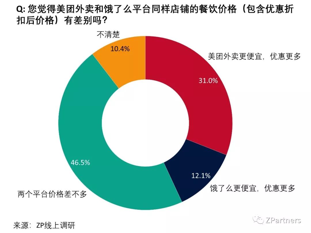 用户调研显示,约一半的用户对谁价格高谁价格低并不清楚;在对价格高低有感觉的用户中,大部分用户认为美团更便宜。在给两者的价格进行满意度打分时,两者的分数也难分伯仲。饿了么要不是就钱还没给够,要不就是白补了。