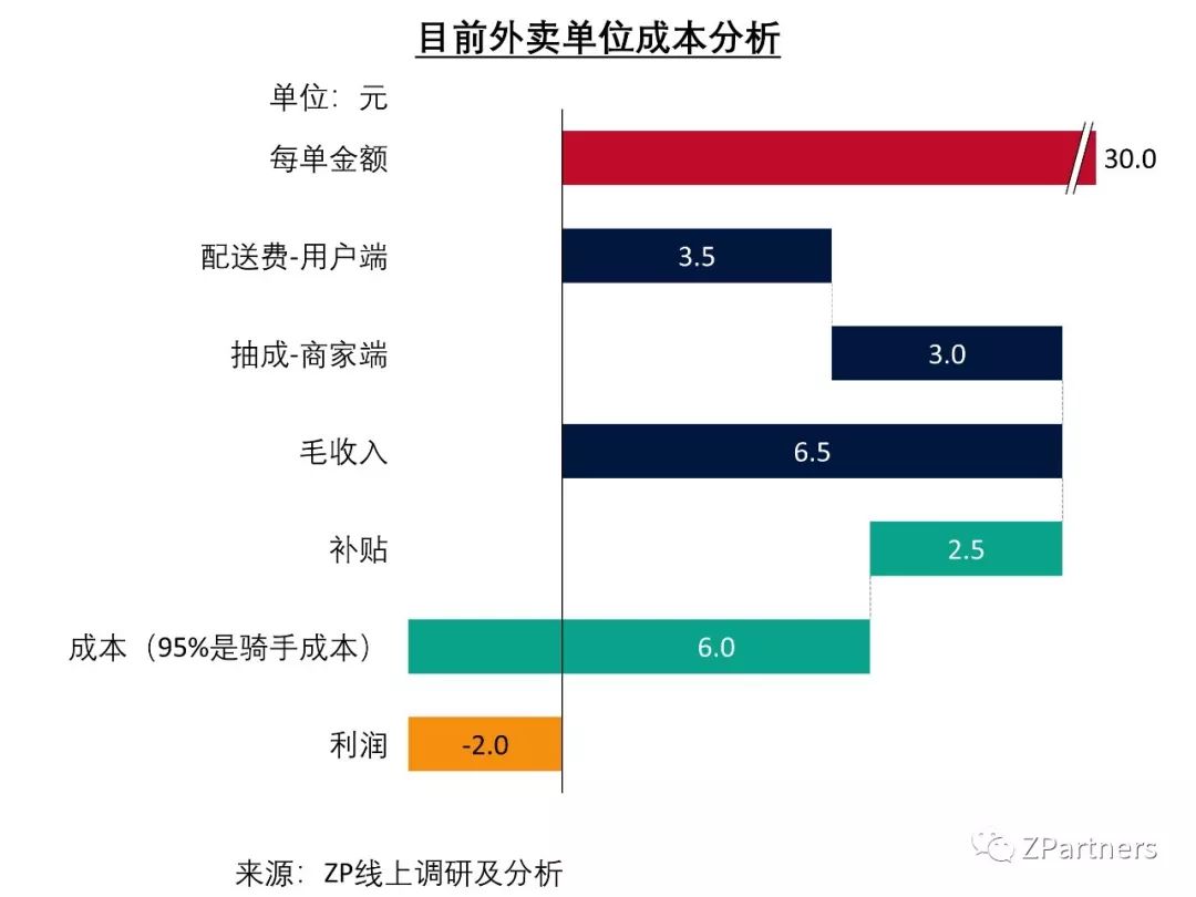 这里和美团公布的统计口径不同,ZP都采用了自己的调研结果:用户每单平均30元的花费(只考虑给自己点单一个人吃),3.5元的配送费(三线城市会很低),商家一单被抽成10%,即3元抽佣——外卖平台一单收入6.5元。