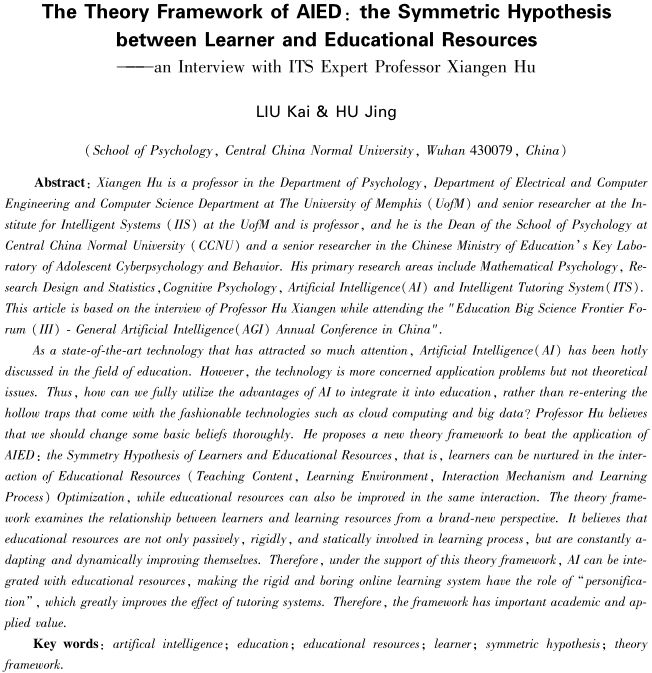 胡祥恩教授是美国孟菲斯大学心理学系、电子计算机工程系、计算机科学系教授,智能系统研究院高级研究员,美国先进分布式学习孟菲斯实验室主任,华中师范大学心理学院院长、中国青少年网络心理与行为教育部重点实验室高级研究员,研究领域包括数学心理学、实验设计与统计、心理学、人工智能和智能导学系统。本文系2018年7月华中师范大学举办的“教育大科学前沿论坛(第三期)一中国通用人工智能高端论坛”会议期间对胡祥恩教授访谈基础上整理而成的。