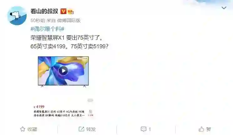 而在近日根据数码博主 @看山的叔叔 的消息,荣耀智慧屏 X1 将推 75 英寸版,目前荣耀智慧屏 X1 的最大尺寸为 65 英寸。所以对于嫌弃 65 寸版本的小伙伴终于可以选择 75 寸的 荣耀智慧屏 X1 了。