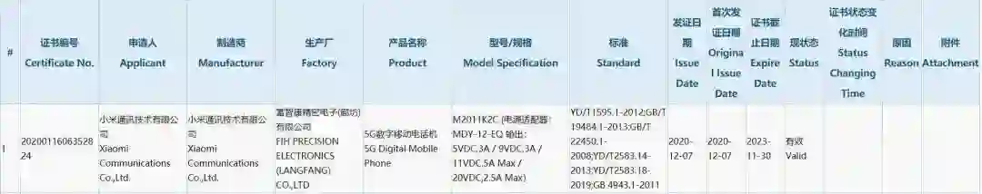 根据消息,小米 11 已正式入网,目前我们已经可以看到小米 11 通过了国家 3C 入网认证。由认证信息我们可以看到,小米11由富智康电子制造,标配全新的 11V5A 快充。而在不久前,小米就有一款相同规格的充电器入网。