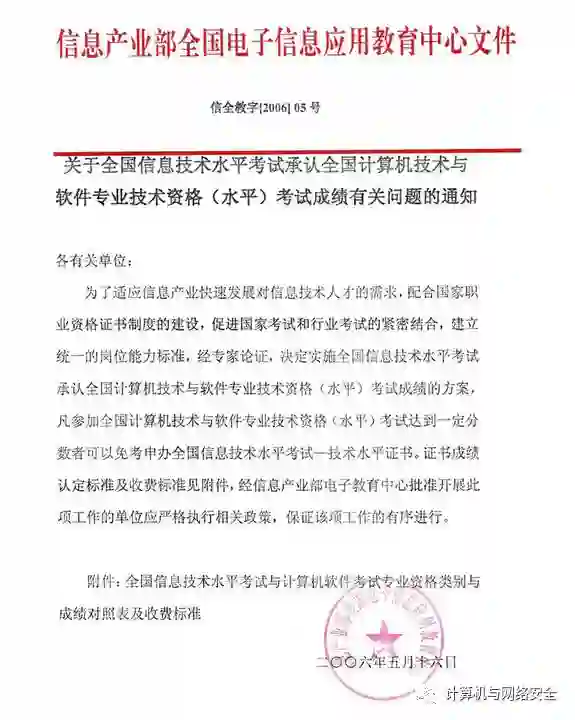根据原信息产业部全国电子信息应用教育中心颁布的《关于全国信息技术水平考试承认全国计算机技术与软件专业技术资格(水平)考试成绩有关问题的通知》(信全教字 [2006] 05 号)的有关精神,凡参加计算机资格考试,某一资格所有科目均达到或者该资格所有科目平均成绩达到一定分数(一般为 40 分及以上)者,可自愿免考申办全国信息技术水平考试一对应技术水平证书。