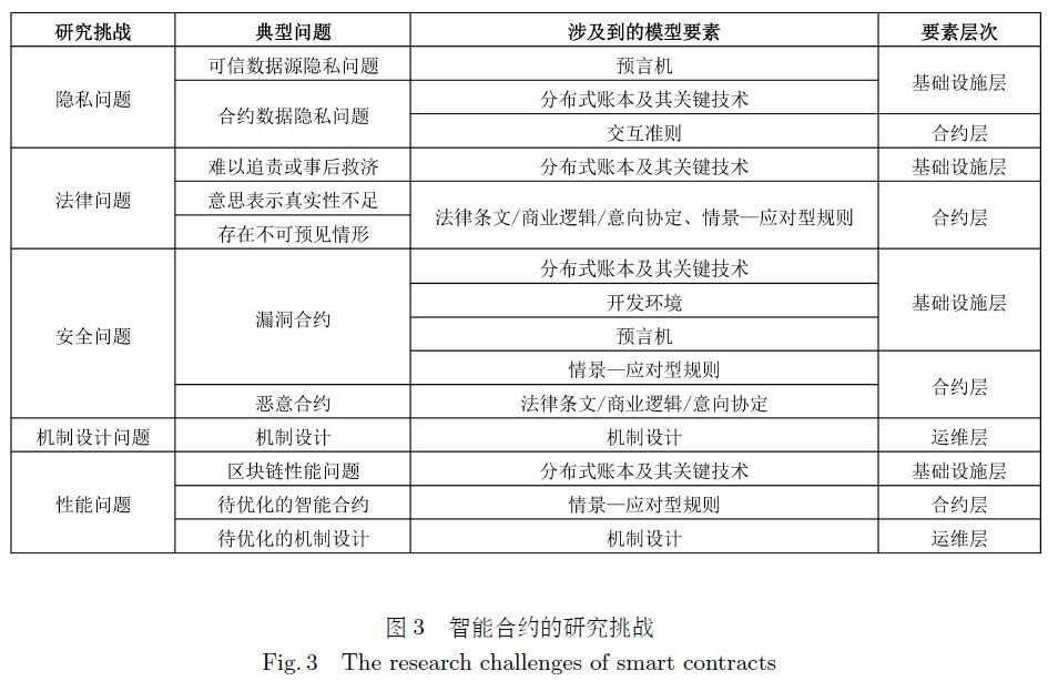 为使行文清晰, 图3总结了第2.1~2.4节中所述智能合约研究挑战、典型问题、涉及到的模型要素和要素层次等.