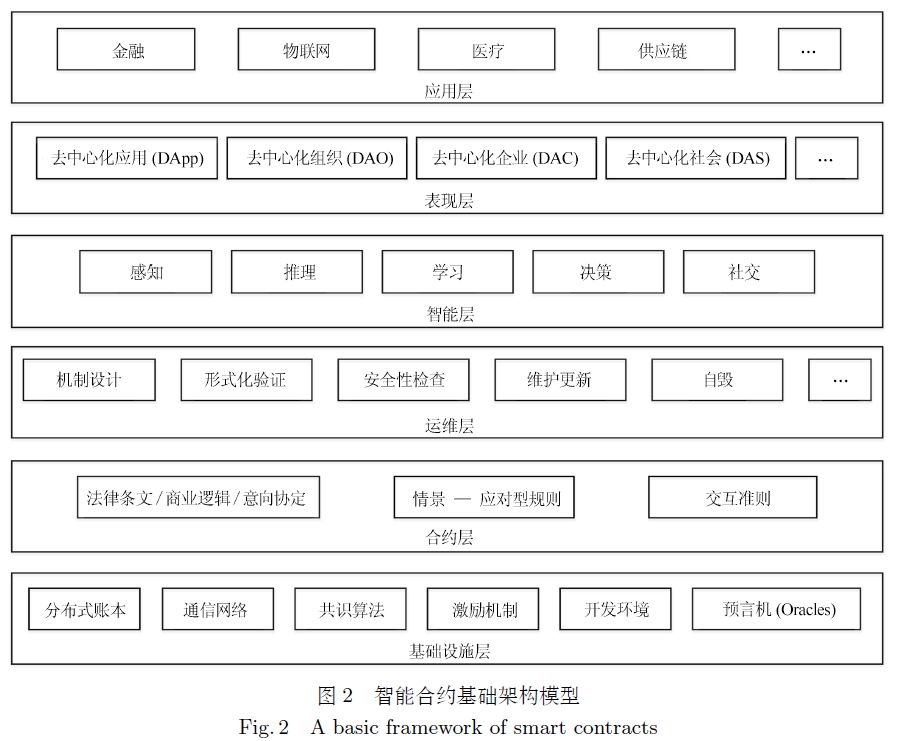 需要特别指出的是, 由于智能合约的研究和应用尚处于早期阶段, 此处提出的智能合约架构模型是一个理想模型.模型中部分要素(特别是智能层中自主自治的多智能体等)仍在探索之中, 尚未完全实现.但考虑到他们是智能合约未来重要的发展方向, 本文仍将其纳入模型中, 以提供一定的前瞻性.