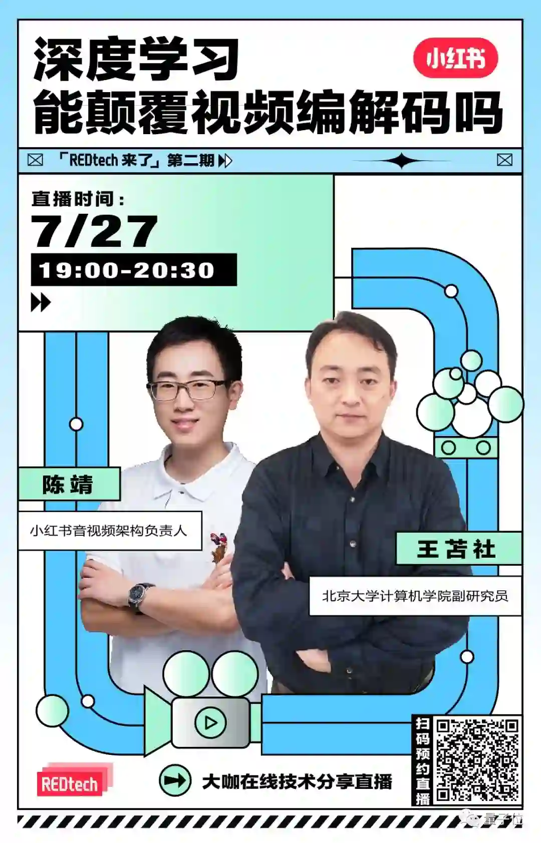 就在7月27日晚上19:00,小红书技术团队将邀请国家技术发明一等奖得主、北京大学计算机学院副研究员王苫社参与【REDtech来了】技术直播,就“视频编码的过去、现在和未来”进行主题分享。