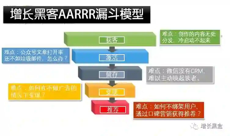 我们来根据增长黑客惯用的AARRR转化漏斗来诊断一下每个环节的核心难点: