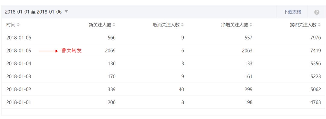 曹大的号召力还是强,1月5号转发当天就给我们增加了2000粉丝,两天就帮我们粉丝数翻了一倍。而且次日取消关注人数只有个位数,比过往日均取关人数稍微多了一丢丢,统计下置信区间,有95%的把握强行认为新增的粉丝一个都没有取关,这大概是对我们文章最好的一种嘉奖吧。