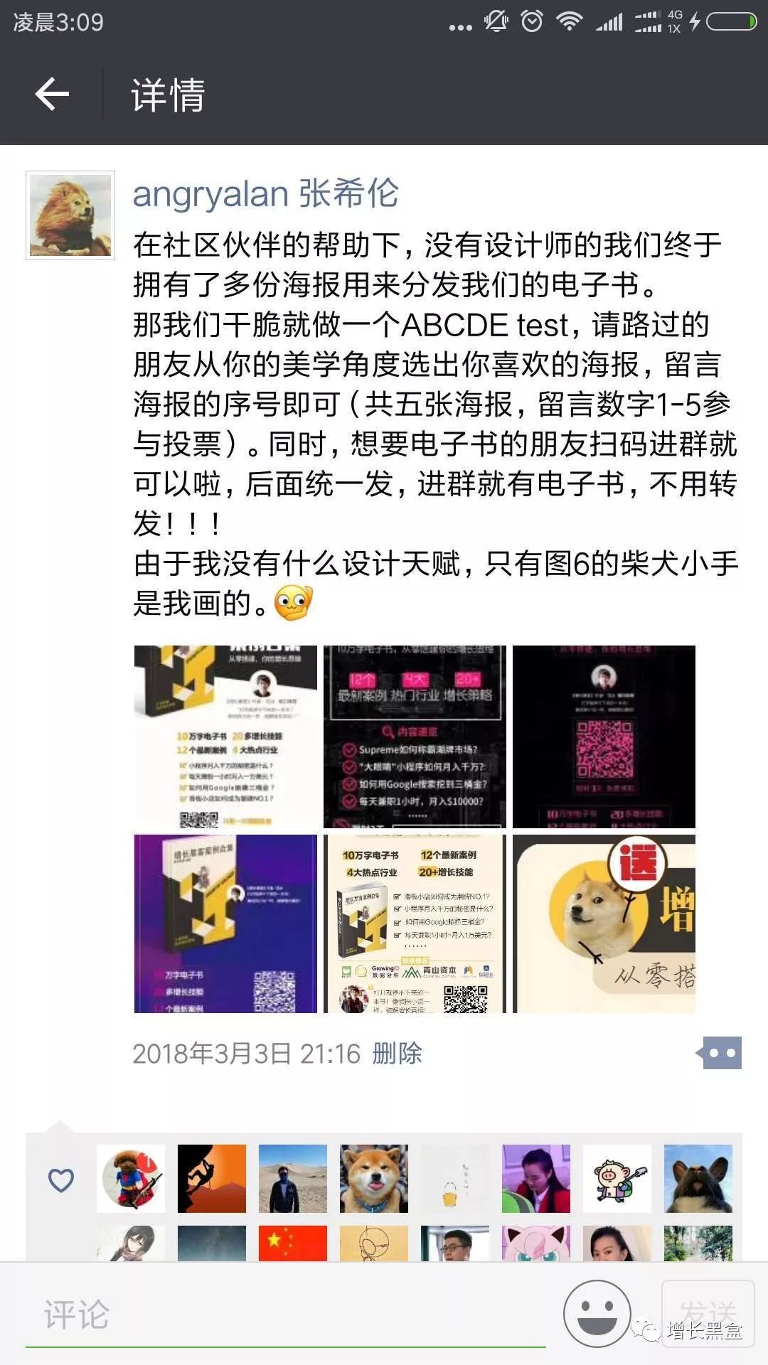 我们请社区里的朋友设计了5款海报,为了选出最好的海报,Alan在朋友圈进行了一波ABCDE test,由我朋友圈两千多个好友来投票。最终收集了120多个评论,选出了胜出者1号海报,而黑色的那两款海报被一致吐槽为丑。