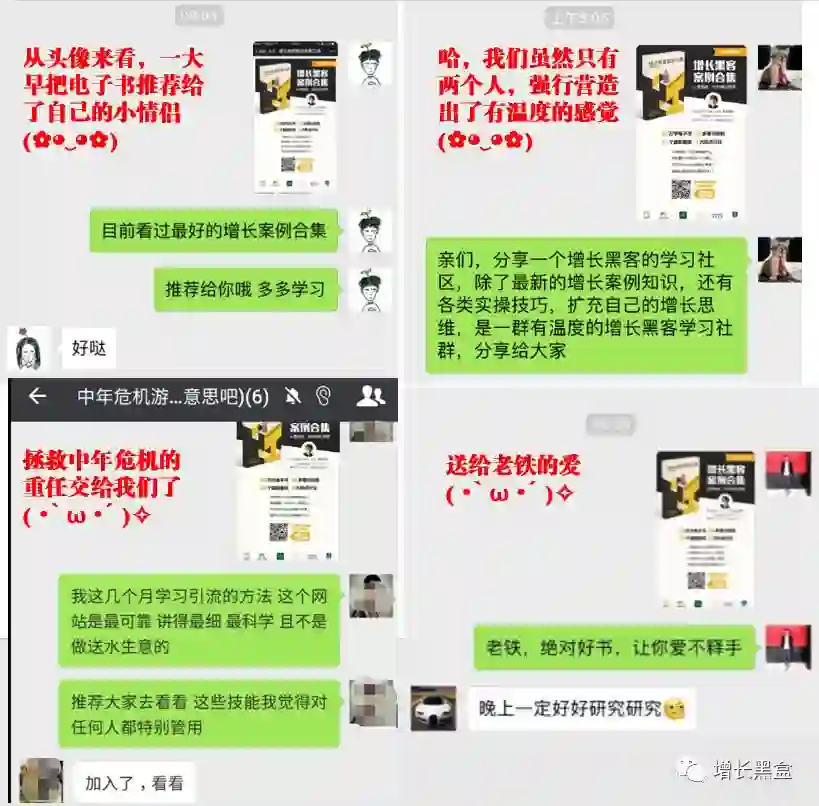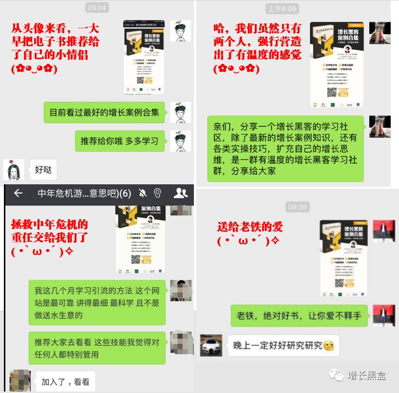 这次电子书裂变活动,将价值认可环节放到了转发之前。也就是说,我们的逻辑是首先问用户“你觉得这本电子书还不错吧?”用户如果认可了,我们会说“帮忙转发一下吧,你能得到未来一年的电子书!”这样做的好处就是大大提升了用户口碑和忠诚度 - 许多人都写下了诚挚的推荐语,并转发海报,截图返还给我们(这个后面会展示)。同时,由于设置了两次奖励,传播路径被大大拉长,K值就被控制的很低,不会有任何风险。