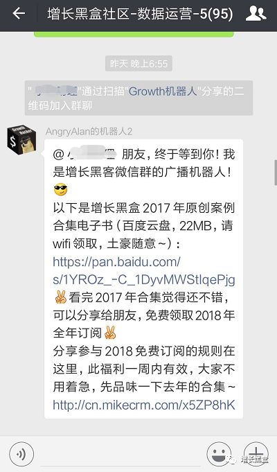 还是最传统的群裂变形式:海报扫码后机器人会直接给出电子书下载链接(百度云盘),并提示用户先看书,觉得内容好再去转发。把转发截图通过表单发给我们,就可以获得2018年的电子书订阅资格!