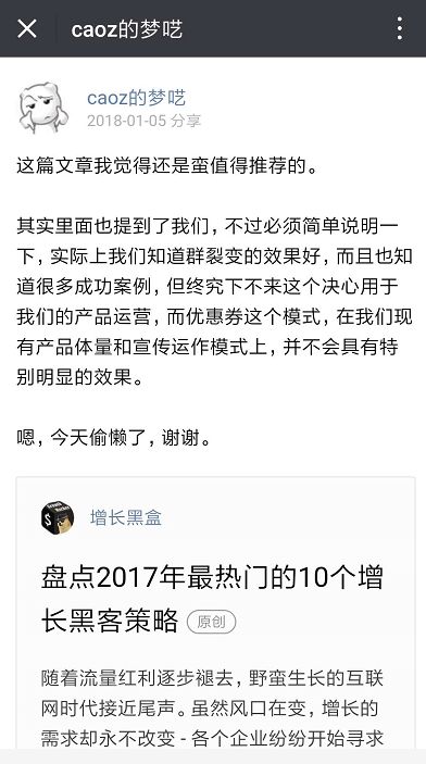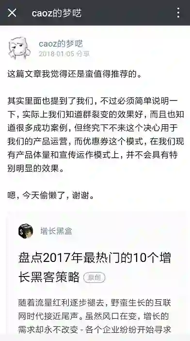 Yolo在2018年1月1号发表了《盘点2017年最热门的增长黑客策略》,希望曹大可以帮我们转发一下这篇文章,文中还假装不经意之间提到曹大的易灵微课。