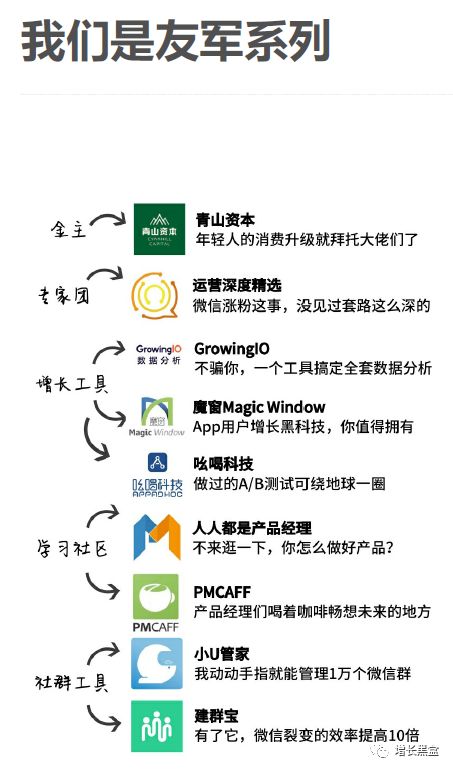 首先是青山资本,虽然我们没有拿他们钱,但是和他们老板聊得来,而且他们旗下很多创业者事实上也是我们的目标受众,所以就随手把logo放上去了。青山资本是专业投消费升级,TMT和泛娱乐的天使基金,非常友善的金主~