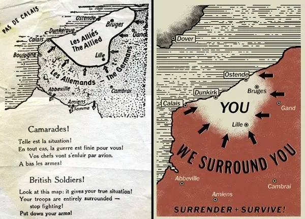 此外,诺兰在很多细节上颇下功夫,片头出现的传单就是其中之一。德军确实向受困的盟军散发过劝降传单,与电影中不同的是,实际散发的传单是黑白印刷的,而且也并不像片中的传单那样简洁并具备感染力。实际散发的传单更加多样化,有一些没有地图,有一些则直接写出投降士兵会受到人到对待。然而,真实的情况是,德军总是枪杀俘虏。