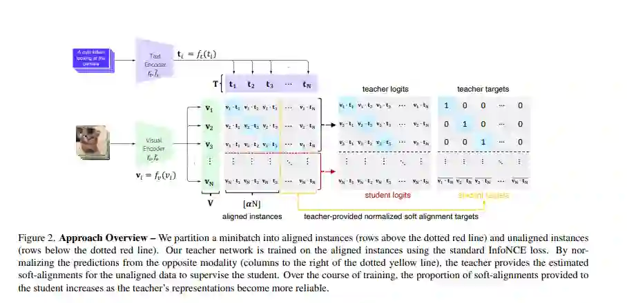 CLIP视觉语言方法的学习目标未能有效地考虑到网络采集的图像描述数据集存在的多对多的噪声,导致其计算和数据效率低下。为了解决这一挑战,我们引入了一种基于跨模态对比学习的新训练框架,该框架使用渐进自蒸馏和软图像-文本对齐,以更有效地从噪声数据中学习鲁棒表示。我们的模型提炼自己的知识,为每个小批中的图像子集和标题动态地生成软对齐目标,然后用来更新其参数。在14个基准数据集上的广泛评估表明,我们的方法在多种设置下始终优于CLIP对应的方法,包括:(a)零样本分类,(b)线性探针传输,(c)图像-文本检索,而不增加计算成本。使用基于ImageNet的鲁棒性测试平台的分析表明,与经过ImageNet训练的模型和CLIP本身相比,我们的方法对自然分布转移提供了更好的有效鲁棒性。最后,使用两个数量级的数据集进行预训练表明,我们对CLIP的改进往往与训练示例的数量成比例。
