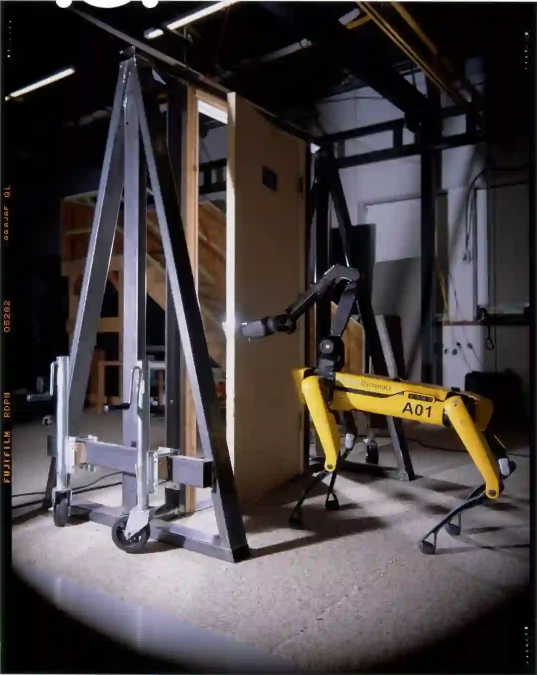 SpotMini机器人可以用可选的附加手臂打开门,然后再用腿把门踢开