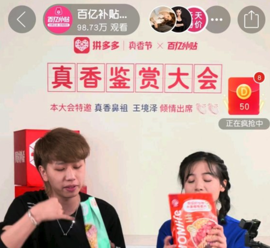 “真香节”上线当天,拼多多也邀请到了“真香”段子的主人公:王境泽,直播分享自己在网购中的“真香”体验,吸引了300余万网友同时在线观看并下单,纷纷表示“爷青回”。