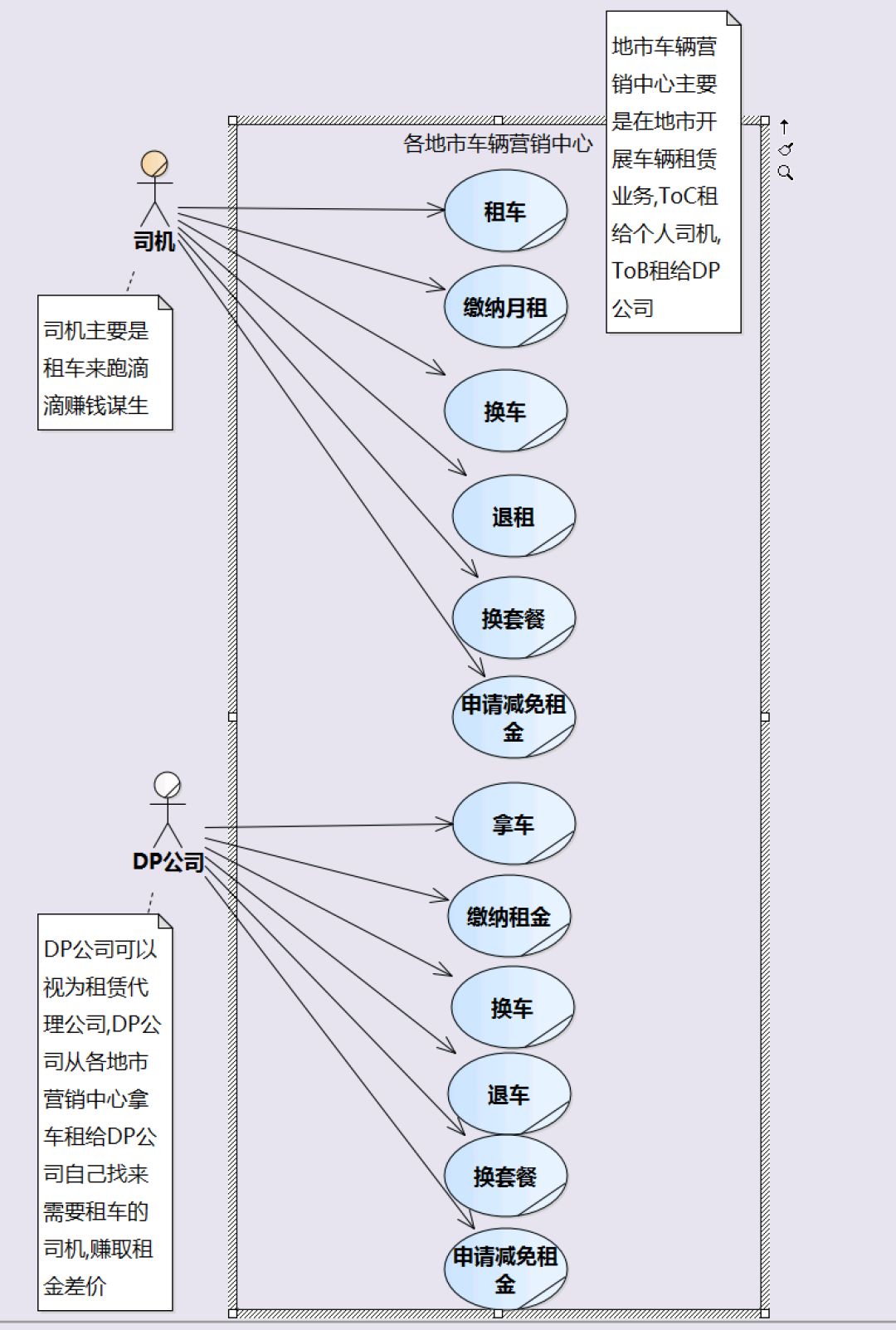 那这个以各地市车辆营销中心为研究对象画的业务用例图,只有2个业务用例? 司机->租车 , DP公司->拿车 ?