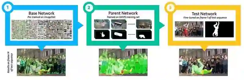 这个过程将生成一个独特的模型,每一个新视频都只使用一次该模型,根据第一帧注释,该模型对于每个视频都是过度拟合的。因为对于大多数视频来说,对象和背景的外观并没有完全改变,这个模型产生了很好的效果。当然,这种模型对其他随机视频镜头来说效果较差。