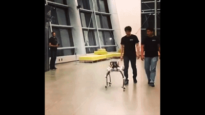 两条腿走路的时候,空出来的其余两条腿则充当胳膊。而且,它两条腿的分布方式也不同于人类,不过这种走法现在还不太稳健。