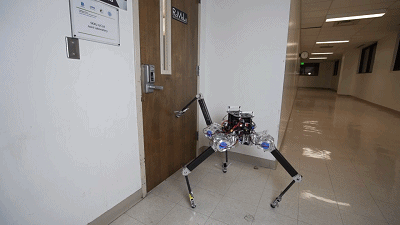 三条腿走路的时候,一条腿拿来当胳膊。这种走法更加稳定,机器人可以完成按按钮、敲门、摧毁物件等任务。