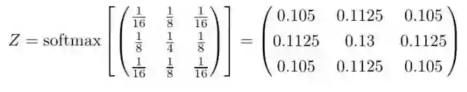 我们可以通过正规化来讲卷积核转化为概率密度函数。这有点像计算输出值的softmax。下面就是对第一个例子中的卷积核执行的softmax结果: