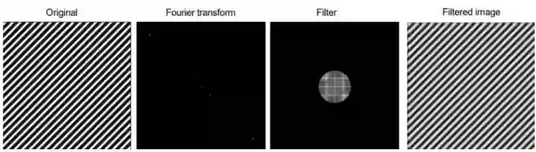 如果我们对图像执行傅里叶变换,并且乘以一个圆形(背景填充黑色,也就是0),我们可以过滤掉所有的高频值(它们会成为0,因为填充是0)。注意过滤后的图像依然有条纹模式,但图像质量下降了很多——这就是jpeg压缩算法的工作原理(虽然有些不同但用了类似的变换),我们变换图形,然后只保留部分频率,最后将其逆变换为二维图片;压缩率就是黑色背景与圆圈的比率。