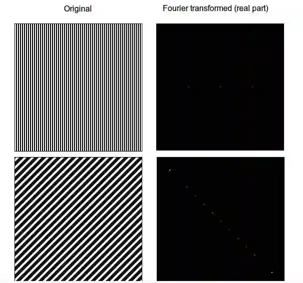 我们马上就可以发现傅里叶变换包含了关于物体朝向的信息。如果物体被旋转了一个角度,从图像像素上可能很难判断,但从频域上可以很明显地看出来。
