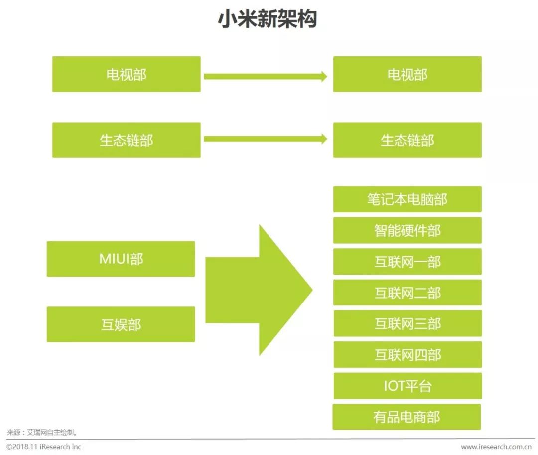 小米此次构架调整包括:新设集团组织部和集团参谋部,进一步增强总部管理职能;电视部、生态链部、MIUI部和互娱部等四个业务部重组成十个新的业务部(四个互联网业务部、四个硬件产品部、一个技术平台部和一个消费升级的电商部),各业务部的总经理直接汇报给CEO。具体如下: