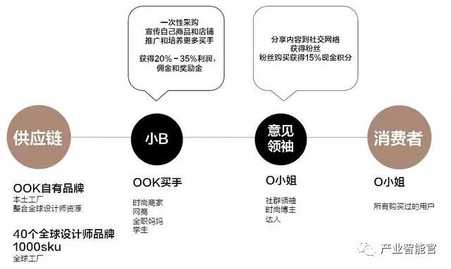 目前国内饰品渠道以线下小店或商场品牌为主,供应链分散,缺乏本土品牌,价格两极化严重,缺乏中高端定价。OOK切中市场缺口,聚集40个全球设计师品牌并逐步整合全球设计师资源建立自有品牌进行供应链建设,通过时尚商家、网商和个体组成的买手小b端进行直销,以社群领袖、时尚博主和达人进行多渠道流量收敛,并不断转化消费者成为意见领袖和小b端。同时,OOK打通线上线下渠道,以OOK为供应链平台,向APP、微信、微博、各大电商以及线下快闪店进行多端口对接,形成从生产、供应链到销售的闭环,不断赋能和扩大小b端,形成良性分销生态圈。
