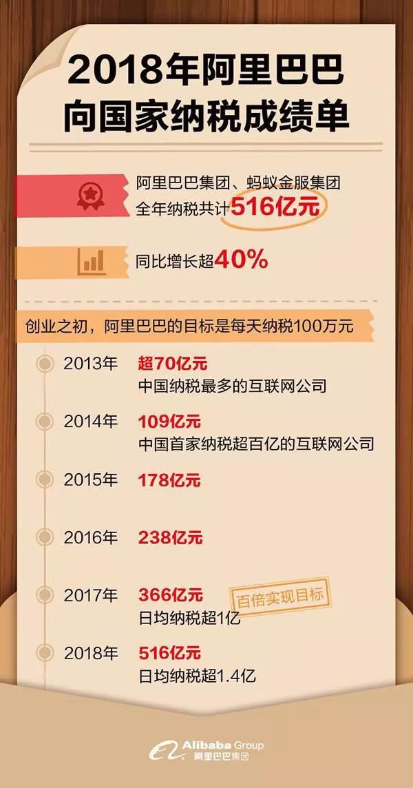 稍早前阿里巴巴公布了自己的纳税成绩单,2018年阿里巴巴与蚂蚁金服共纳税516亿元,同比增长超过40%,每天纳税超1.4亿元。