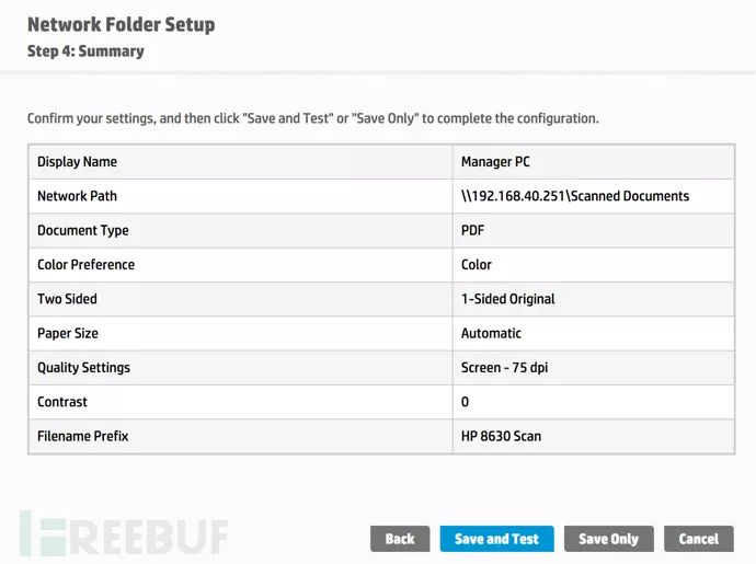 在网络上这个打印机被配置为,扫描和保存文档到单独的计算机工作组中。另外我发现它的配置文件可被随意编辑更改,而不需要任何的权限认证。